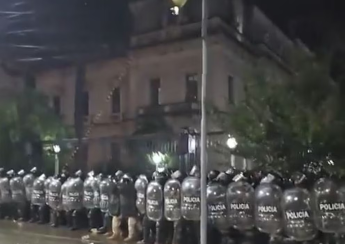 Los manifestantes quemaron gomas, lanzaron piedras y pirotécnia, y quisieron tirar las rejas que rodean a la sede oficial de la Provincia. Un tenso momento…