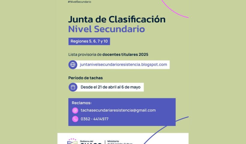 El Ministerio de Educación, a través de la Junta de Clasificación de Nivel Secundario Sede Resistencia -Regiones 5, 6, 7 y 10-, comunica que ya…