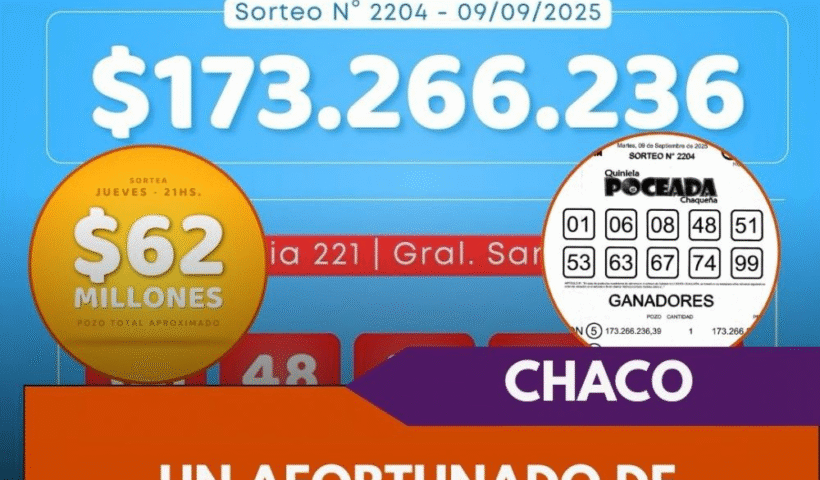Este martes 9 de septiembre se realizó el sorteo N° 2204 de la Poceada Chaqueña, con un pozo principal que alcanzó los $173.266.236,39. Los números sorteados fueron: 01,…