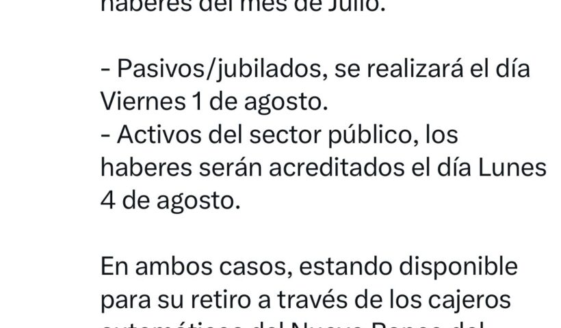 Este jueves, el gobernador Leandro Zdero informó que los haberes correspondientes al mes de julio estarán depositados de acuerdo al siguiente cronograma: -Jubilados: el viernes…