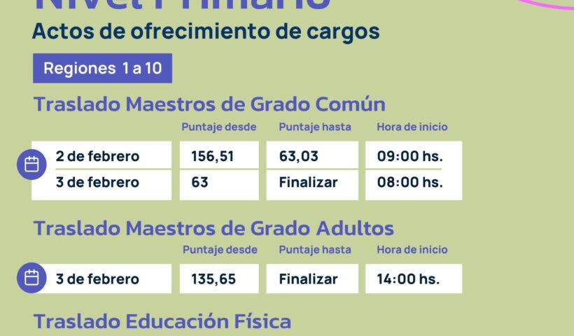 Este lunes 2 de febrero, comenzarán los actos de ofrecimiento de cargos para docentes de nivel Primario de toda la provincia inscriptos en los concursos…