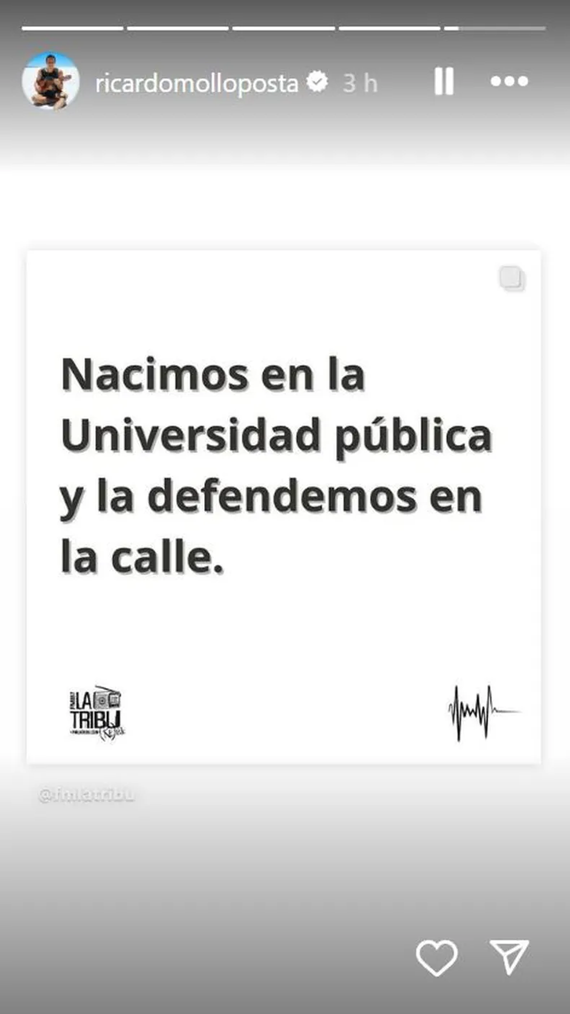 Por su parte, el líder de Divididos, Ricardo Mollo, utilizó la red social Instagram para expresar su apoyo a la Marcha Federal Universitaria. Mediante una historia en su cuenta oficial el cantante compartió una publicación de FM La Tribu donde expresa la frase “nacimos en la Universidad pública y la defendemos en la calle”.
