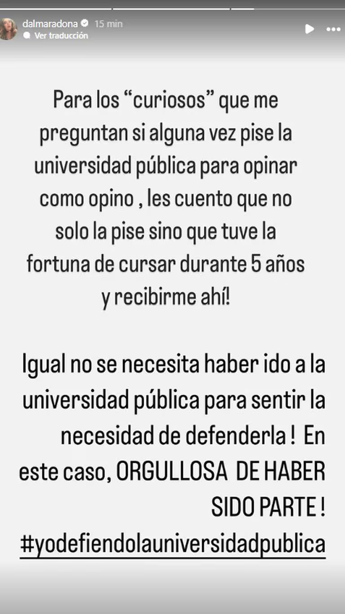 “Para los ‘curiosos’ que me preguntan si alguna vez pisé la universidad pública para opinar como opino, les cuento que no solo la pisé, sino que tuve la fortuna de curar durante 5 años y de recibirme ahí. Igual no se necesita haber ido a la universidad pública para sentir la necesidad de defenderla. En este caso, orgullosa de haber sido parte”, sostuvo.