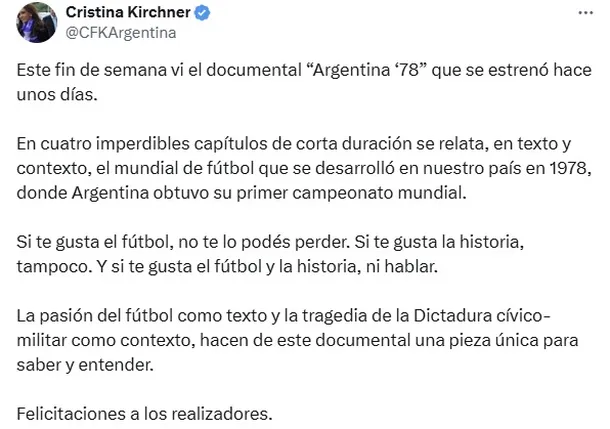 Cristina Kirchner había recomendado ver el documental: “Si te gusta el fútbol, no te lo podés perder. Si te gusta la historia, tampoco. Y si te gusta el fútbol y la historia, ni hablar. La pasión del fútbol como texto y la tragedia de la Dictadura cívico-militar como contexto, hacen de este documental una pieza única para saber y entender”, publicó el domingo por la mañana junto a un flayer de la serie.