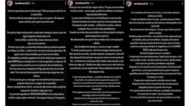 Cansada de las versiones que circulaban en redes sociales, en las que se aseguraba que recibía un millón de pesos mensuales del actual novio de Wanda Nara en concepto de cuota alimentaria, Báez no dudó en salir a aclarar la situación. A través de un fuerte y contundente descargo en sus historias de Instagram, la expareja del cantante dejó en claro su postura. A lo largo de su relación con Elián, Tamara había calificado su vínculo como “tóxico”, afirmando que él la dejó sola en diversas ocasiones tras el nacimiento de su hija. Fue entonces cuando decidió acudir a la Justicia para reclamar lo que merecía.