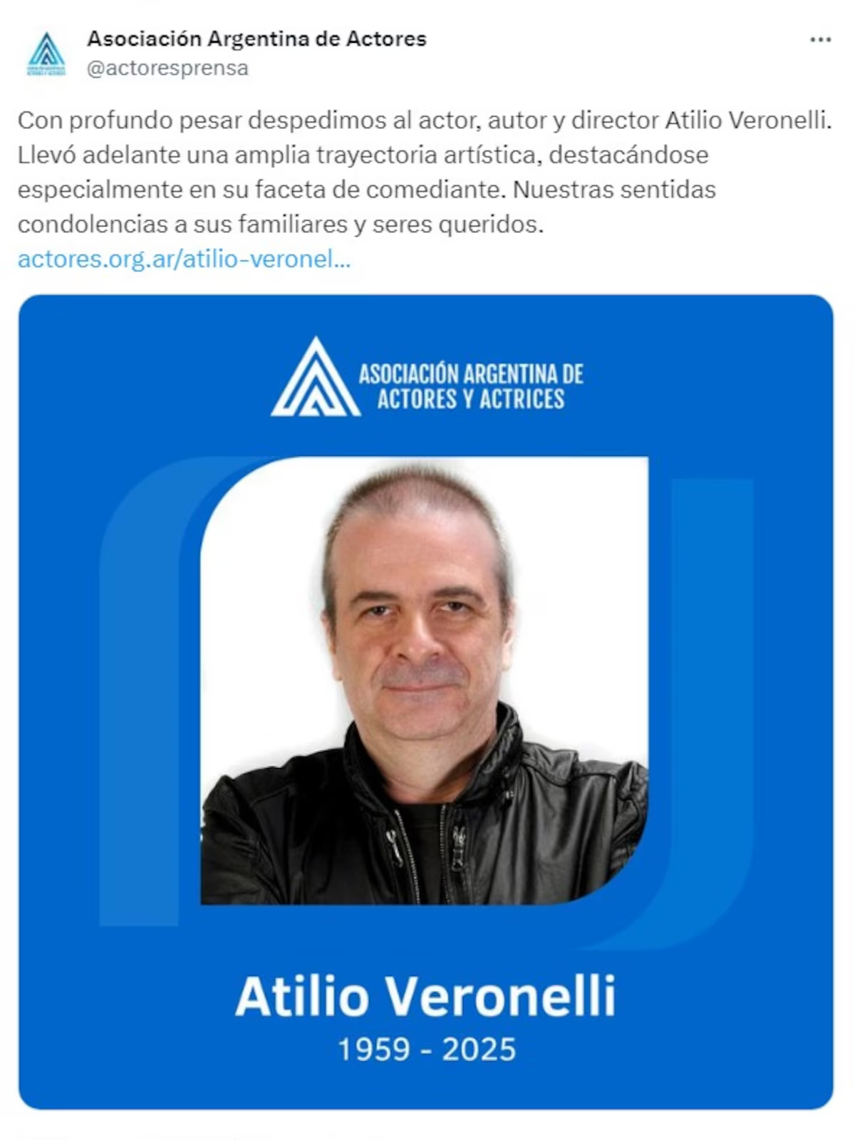 Este domingo 23 de febrero el mundo del espectáculo se vistió de luto luego de conocerse la muerte de Atilio Veronelli a los 65 años. A lo largo de su amplia trayectoria, Veronelli destacó especialmente en su faceta como comediante, siendo un referente de la risa y el talento en múltiples áreas del arte. La Asociación Argentina de Actores, a través de su comunicado, expresó sus sentidas condolencias a los familiares y seres queridos del artista, abrazándolos en esta dolorosa situación. Si bien hasta el momento no hubo un parte oficial sobre las causas de la muerte del artista, allegados a Veronelli le informaron a Teleshow que habría ocurrido a causa de un infarto.