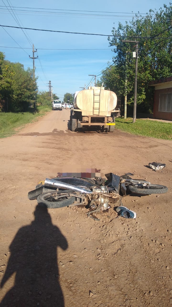 En las primeras horas de la mañana se tomo conocimiento sobre un accidente de tránsito entre una motocicleta Zanella ZB 110cc y un camión cisterna Volkswagen perteneciente al Municipio Local, resultó en la muerte de un motociclista de 20 años. El conductor de la motocicleta fue trasladado inicialmente en ambulancia en estado grave e inconsciente. Posteriormente, se confirmó su fallecimiento en el Hospital Local. El examen médico determinó un traumatismo de cráneo,fractura expuesta en la pierna derecha y laceraciones,determinándose que la causa de la muerte fue un paro respiratorio por el fuerte impacto. El conductor del camión cisterna no sufrió lesiones y dio negativo en la prueba de alcoholemia. Se realizó la extracción de sangre al conductor del camión para análisis. Ambos vehículos permanecen secuestrados. El cuerpo del fallecido fue entregado a sus familiares.