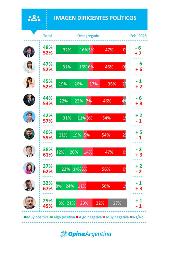“En el mes de marzo, se observa un deterioro pronunciado en las credenciales de imagen tanto de Javier Milei como de otras figuras del oficialismo”, detalla en su informe Opina Argentina.