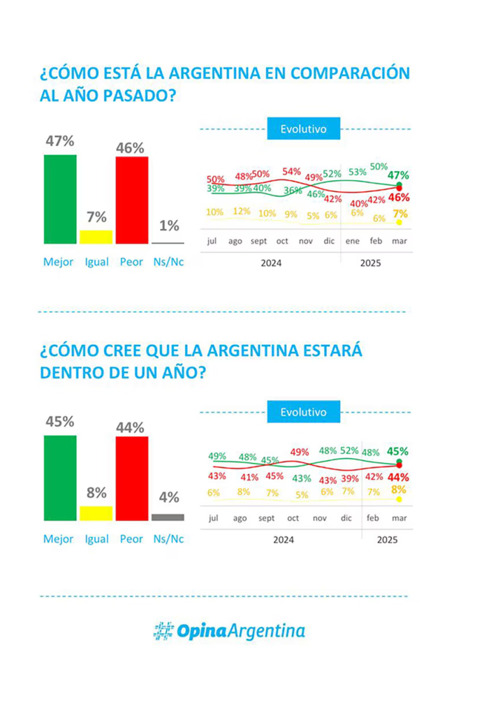 Comparado con la consulta que Opina Argentina hizo en meses anteriores, el apoyo al gobierno cayó de manera consecutiva desde diciembre, cuando tenía 45% de apoyo y apenas creció la oposición: en diciembre y enero tenía 37% y en febrero había subido a 38%.