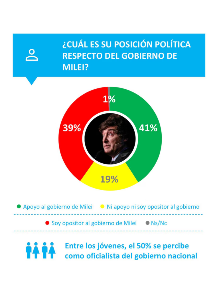 La consultora preguntó a los encuestados sobre su posición política respecto del gobierno de Milei. Cuatro de cada 10 (41%) respondieron que apoyan, y en la misma proporción (39%), que son opositores. Una porción importante (el 19%) no se percibe ni a favor ni en contra.