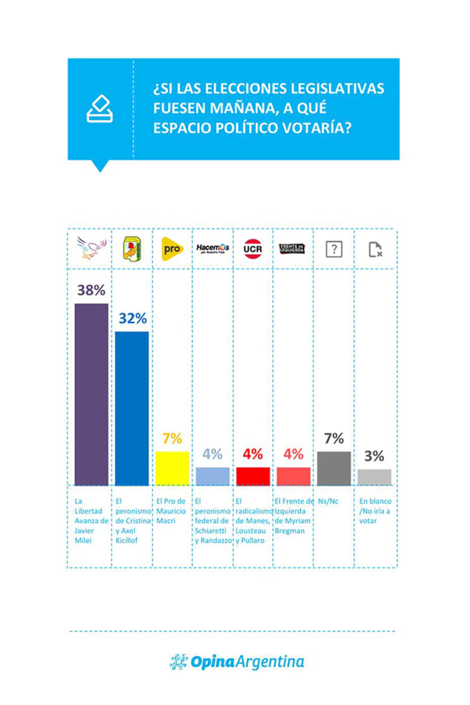 La respuesta se agrupó en favor de La Libertad Avanza de Javier Milei en un 38%, contra un 32% de “el peronismo de Cristina y Axel Kicillof”. Muy detrás aparece “el Pro de Mauricio Macri” (7%) y otros espacios con menos del 5% cada uno. Además, el 7% consideró que no sabe a quién votaría.