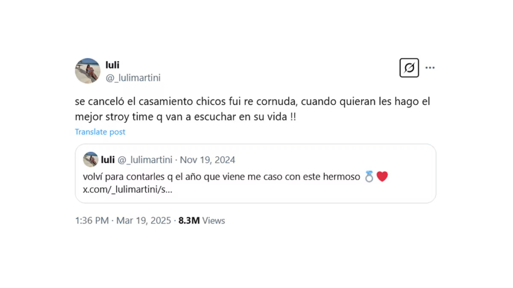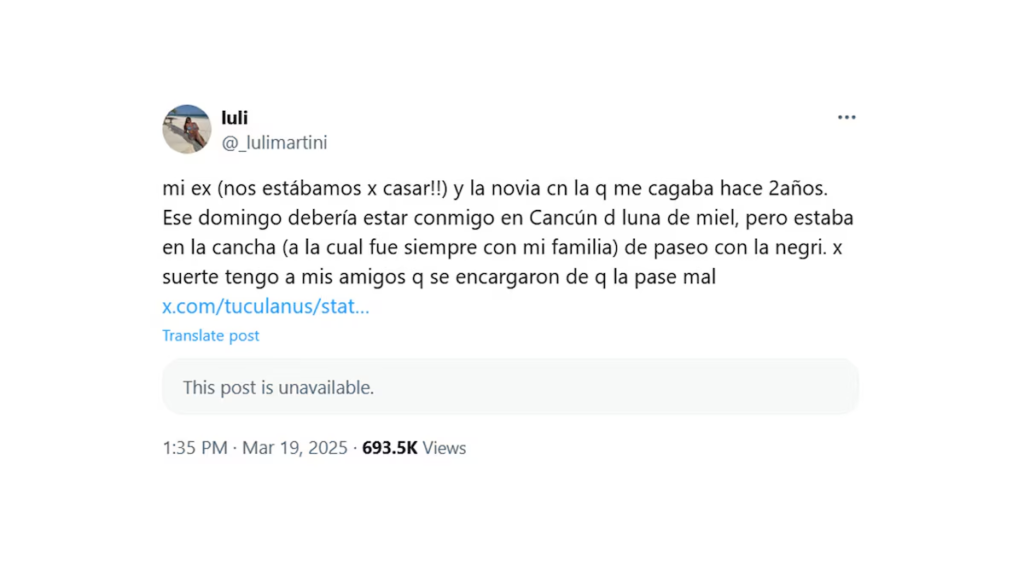 La publicación generó miles de interacciones y rápidamente se volvió tendencia. Ante la repercusión, Luli citó un viejo tuit en el que contaba cómo su relación estaba atravesada por su pasión en común por Lanús y su inminente casamiento. “Se canceló el casamiento chicos, fui re cornuda. ¡¡Cuando quieran les hago el mejor story time que van a escuchar en su vida!!”, escribió. A medida que la historia tomaba mayor alcance, la hincha decidió compartir los detalles de cómo se enteró de la infidelidad y de las consecuencias que tuvo en su vida. “Bueno, procedo con el chisme. 1 de marzo, muy tranquila en mi despedida de soltera, me llega un mensaje de la mina en cuestión, ¡¡contándome que hacía dos años salía con mi ex!! Me mandó fotos, pruebas, todo. Imagínense mi cara en ese momento”. Según detalló Luli, tras conocer la verdad, enfrentó a su pareja, quien entró “en crisis”. “Le hablo a él, le digo que me enteré de todo y que tenemos que hablar. A todo esto, yo estaba con mis amigas por salir y él estaba con mis amigos en su casa. Cuestión, el chabón entra en crisis y mis amigos lo traen a casa sin entender lo que estaba pasando. Acá los detalles están de más, hablamos un toque y todo era llanto y dolor. Cabe aclarar que en ningún momento ni mis amigos ni mi familia le tocaron un pelo, aunque se lo re merecía, pero se manejó todo de una forma muy decente”. La joven explicó que su casamiento por civil estaba previsto para el 6 de marzo y la fiesta para el día siguiente, con todo ya organizado y pagado. Sin embargo, decidió suspenderlo de inmediato. “Pero aunque eso fue una cagada, el chabón la siguió cagando. Desde ese 1ro de marzo hablamos un par de veces y hasta la semana pasada estuvo pidiéndome perdón a mí, a toda mi familia y la suya, jurando que estaba equivocado, diciendo que tenía que cambiar, que se había arruinado la vida con esa mina y bla bla”, escribió en X.