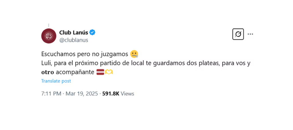 El testimonio de Luli generó un sinfín de reacciones y muestras de apoyo en redes sociales. La repercusión de su historia llegó hasta el propio club Lanús, que decidió intervenir con un mensaje que llamó la atención de todos. A través de su cuenta oficial de X, la institución le realizó una inesperada propuesta: “Escuchamos pero no juzgamos. Luli, para el próximo partido de local te guardamos dos plateas, para vos y otro acompañante”. Ella, por su parte, aceptó la invitación y agradeció el gesto. “Ahí estaremos, gracias por el aguante!”, escribió.
