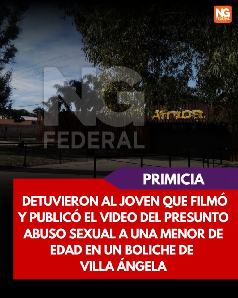 Este domingo por la noche, fue demorada la persona que grabó y difundió el video de un presunto abuso sexual de un joven a una menor de edad dentro de un boliche Villa Ángela. La denuncia fue presentada por la madre de la adolescente tras la difusión del caso por NG Federal. Noticia en desarrollo..
