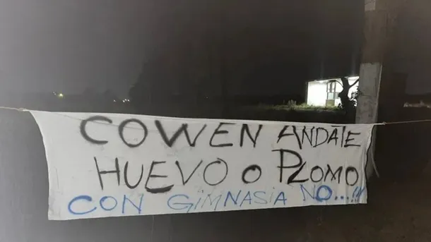 A la entrada del predio barras colgaron una bandera con un mensaje al presidente del club, Mariano Cowen y a los jugadores del primer equipo del Lobo. “Cowen andate. Huevo o plomo. Con Gimnasia no!”, advierte el amenazante mensaje.