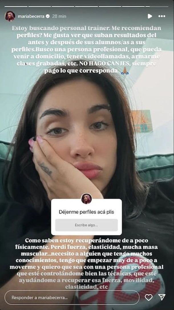 El pedido tiene relación directa con el difícil momento de salud que atravesó recientemente, tanto a nivel emocional como físico. “Como saben estoy recuperándome de a poco físicamente. Perdí fuerza, elasticidad, mucha masa muscular”, explicó.