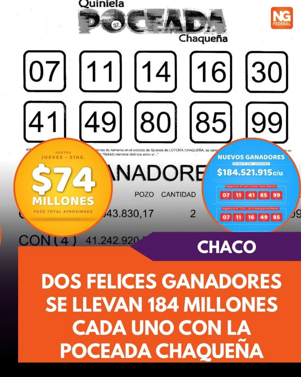 El Sorteo N°2156 de la Poceada Chaqueña dejó dos nuevos millonarios en la provincia: cada uno se llevó exactamente $184.521.915,09. Ambos apostaron en agencias diferentes, pero compartieron la misma suerte que, como siempre, llegó sin previo aviso.