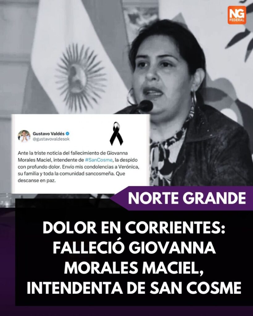 La intendenta de San Cosme, Giovanna Morales Maciel, falleció este sábado en horas de la madrugada luego de haber sido internada el viernes por una descompensación sufrida en su domicilio. La noticia fue confirmada por fuentes oficiales y causó conmoción en la comunidad y en el ámbito político de Corrientes.