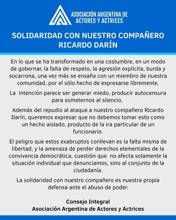 En el documento difundido por su Consejo Integral, la Asociación dejó en claro su preocupación ante lo que consideran no un hecho aislado, sino parte de una modalidad instalada desde el poder: atacar a figuras públicas por manifestar opiniones personales. “Se trata de una práctica repetida, una manera de ejercer el poder”, señala el texto. La organización gremial manifestó su alarma frente a lo que define como “un ataque tosco y burlón” contra Darín, advirtiendo que estas acciones no buscan solo desacreditar voces disidentes, sino también sembrar temor entre quienes piensan distinto. “El objetivo es disciplinar, instalar el miedo, y lograr que el silencio se imponga por sobre el pensamiento libre”, remarcaron.