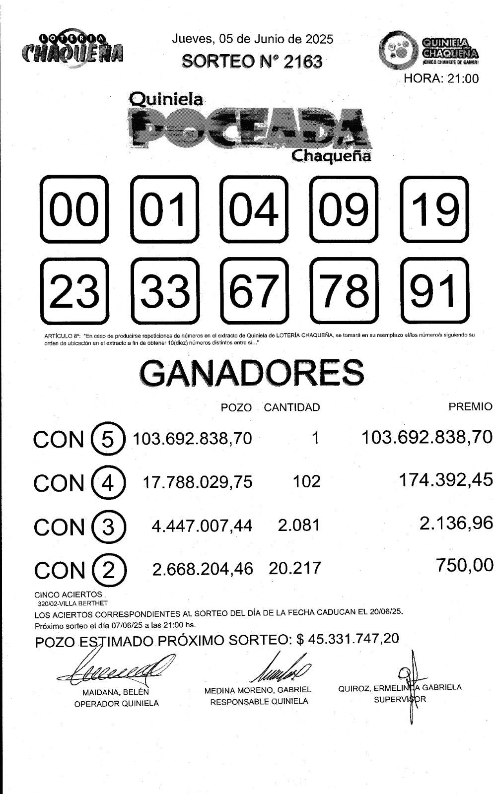 Los números sorteados fueron: 00-01-04-09-19-23-33-67-78 y 91. Con cuatro aciertos, hubo 102 ganadores que se llevarán 174.000 pesos cada uno. El próximo sábado el pozo tendrá un piso de premio de 45 millones de pesos.