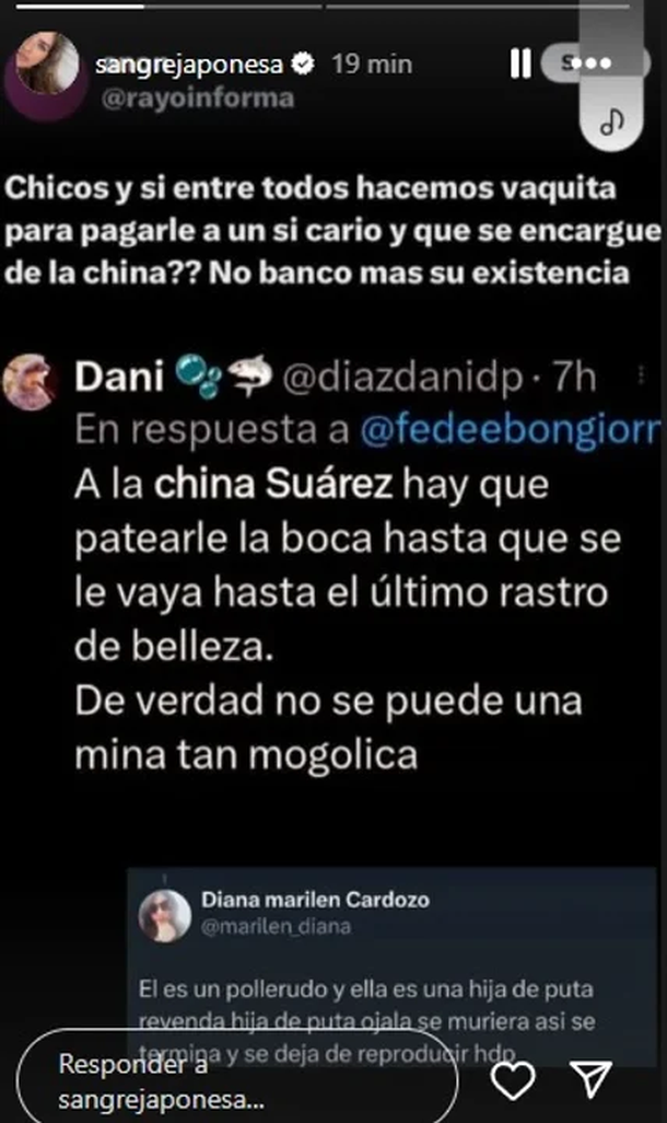 Otro, aún más violento, decía: “A la China Suárez hay que patearle la boca hasta que se le vaya hasta el último rastro de belleza. No se puede una mina tan mogólica”. También hubo mensajes cargados de odio de género como: “Ojalá se muriera así se termina y se deja de reproducir HDP”, firmado por una usuaria identificada como Diana.