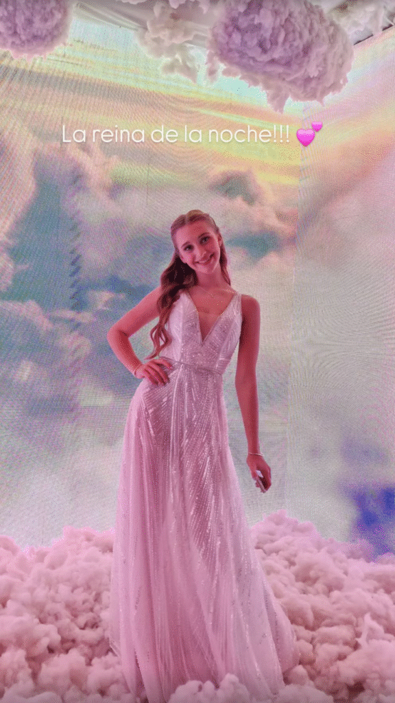 Antonia tuvo dos cambios de vestuario, pensados para acompañar los distintos momentos de la velada. En la primera parte de la noche, durante la recepción, el vals y las fotos familiares, lució un vestido largo en blanco con bordados de cristales, escote en V y caída fluida. El tejido, liviano y con transparencias sutiles, fue clave para dar una imagen sofisticada y contemporánea. El look se completó con el cabello suelto, dos trenzas finas que enmarcaban el rostro y un maquillaje natural, que resaltó la frescura de su rostro.