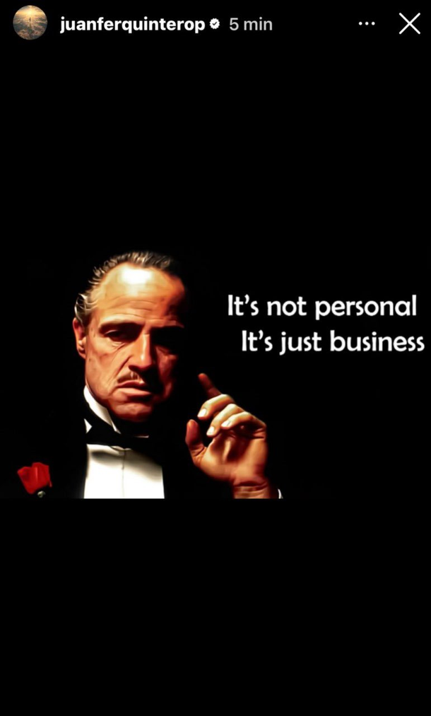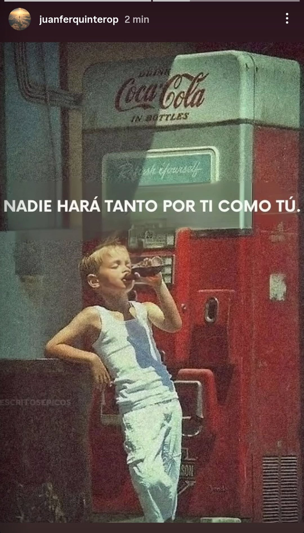 Quintero compartió una primera foto de Al Pacino como Michael Corleone, protagonista de la serie “El padrino”; junto a la frase “No es personal, son solo negocios (It ‘s not personal, it’ s just business)”. Veinte minutos más tarde agregó la imagen de un niño tomando una gaseosa con el mensaje “Nadie hará tanto por ti como tu”.