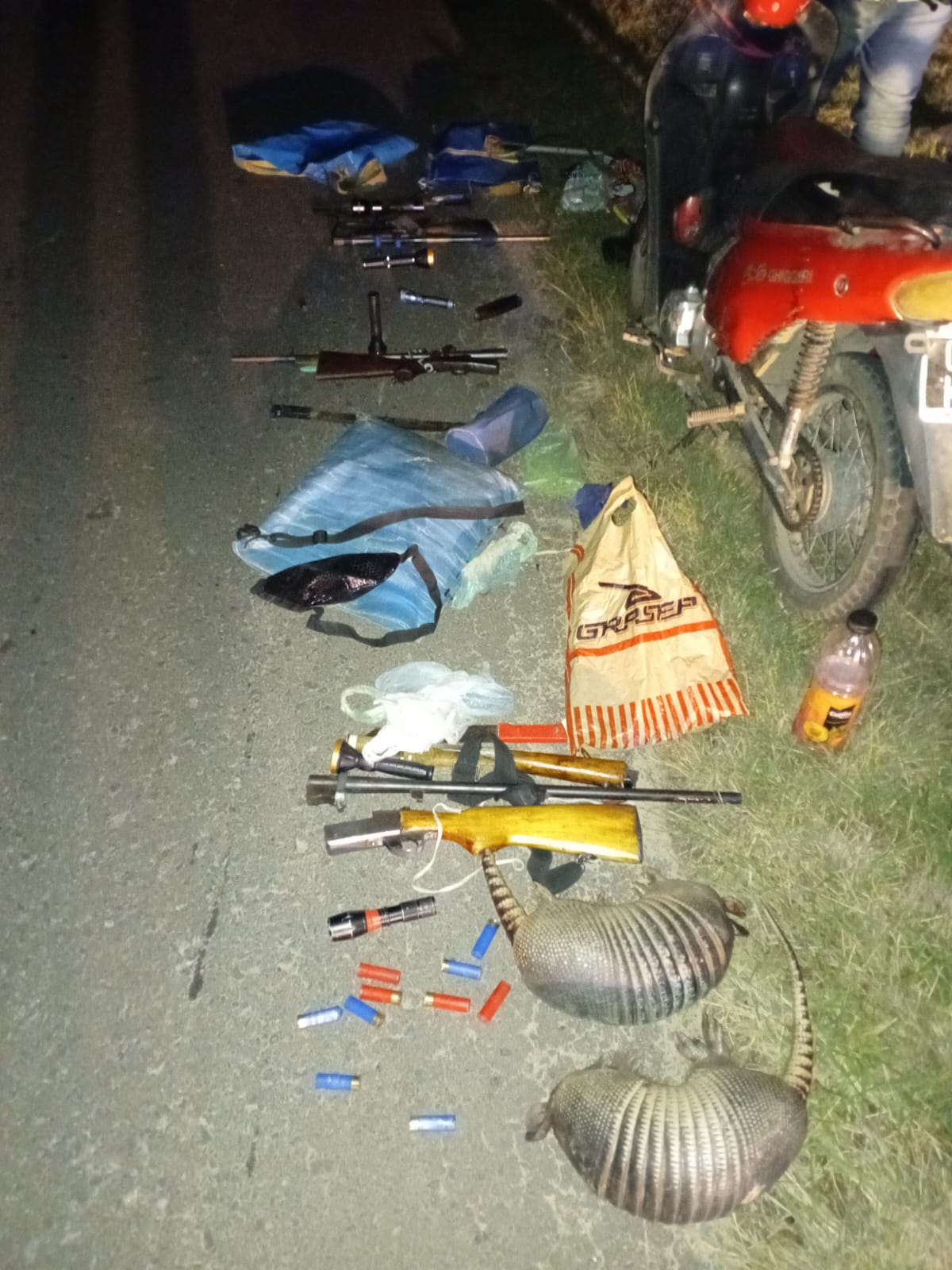 Momentos después, el mismo personal patrullaba la Ruta Provincial N° 7, a 10 km de Colonias Unidas, cuando interceptó dos motociclista mayores de edad, quienes también manifestaron estar cazando. Tras ser identificado, establecieron que llevaban tres escopetas de calibre 16 mm, tres machetes, varios cuchillos, cinco linternas, 20 Cartuchos calibre 16 mm y (02) Animales silvestres (quirquinchos), especie Chaetophractus nationi.