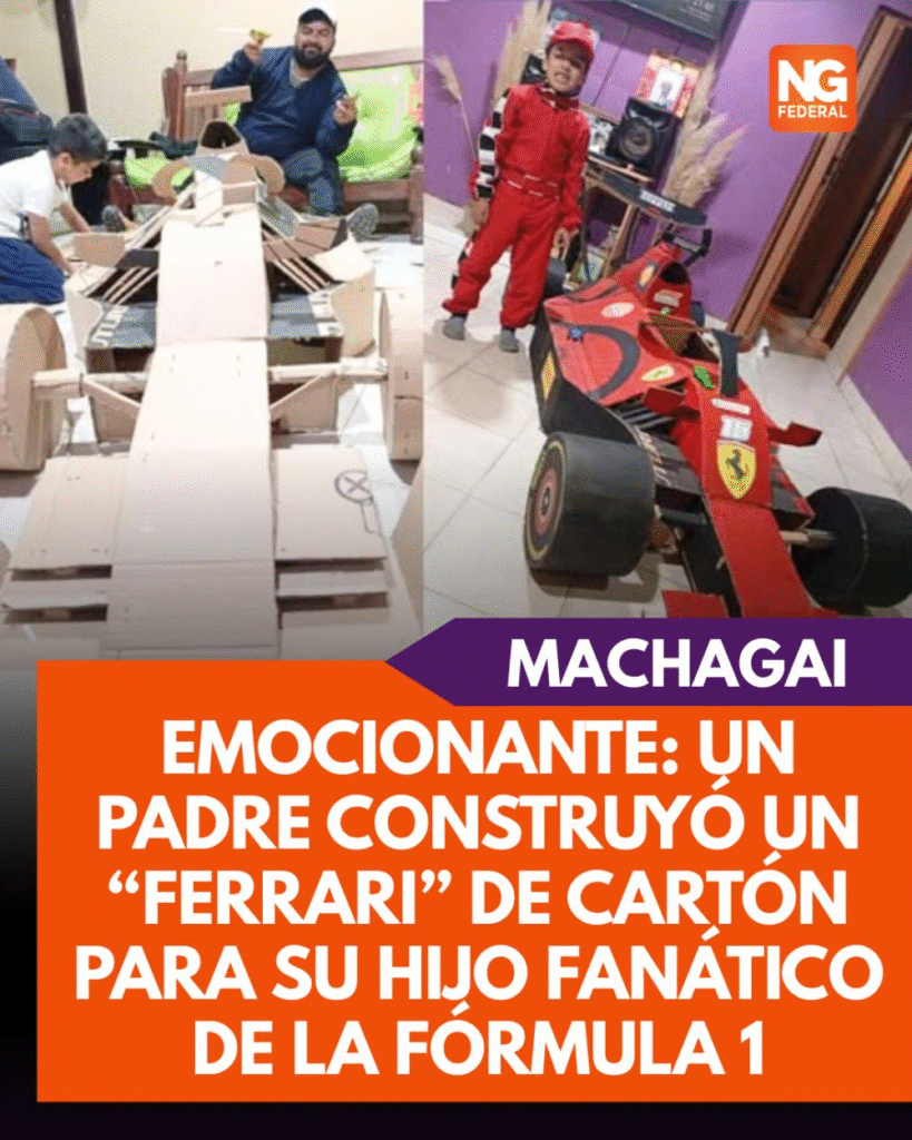 En Machagai, un padre sorprendió a su hijo de 7 años con un regalo único: una réplica de un Ferrari de Fórmula 1 hecha totalmente de cartón. El obsequio, realizado a mano y con todos los detalles del auto original, se convirtió en el sueño cumplido del pequeño fanático del automovilismo.