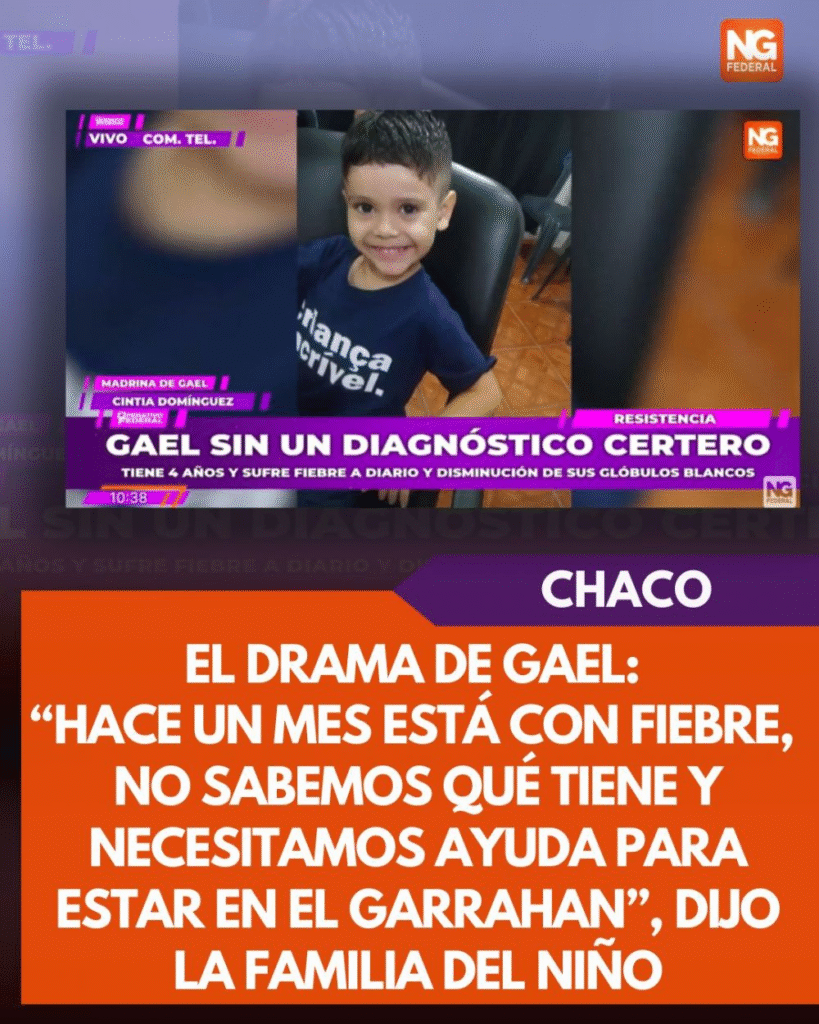 Gael, un niño de 4 años, sigue sin diagnóstico mientras sufre fiebre diaria y una baja crítica de glóbulos blancos, por lo que fue derivado al Hospital Garrahan. En diálogo con NG Federal, su madrina, Cintia Domínguez, afirmó: “Estamos muy movilizados como familia, no sabemos qué le van a decir y necesitamos apoyo económico para su estadía”.