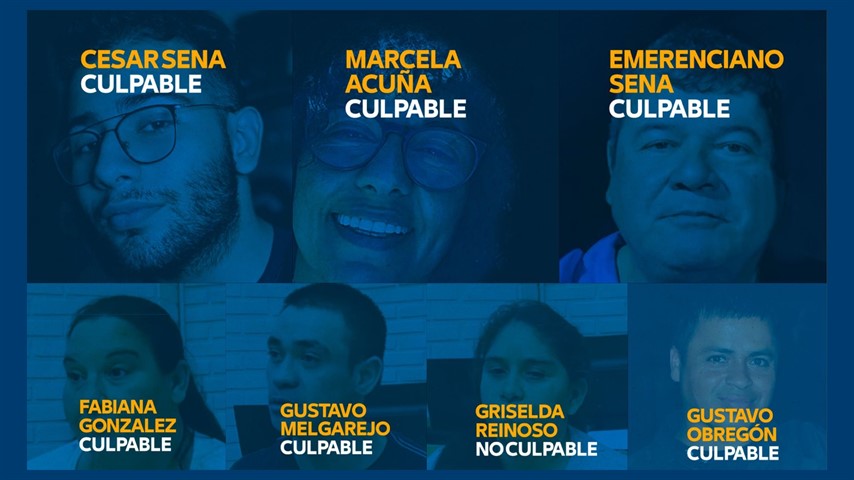 El jurado popular declaró culpable a César Sena por el delito de homicidio doblemente agravado por el vínculo y por violencia de género. En tanto que Emerenciano Sena y Marcela Acuña fueron declarados culpables como partícipes primarios. Por su parte Fabiana González y Gustavo Obregón fueron encontrados culpables del delito de encubrimiento agravado. Todos conforme el requerimiento fiscal.