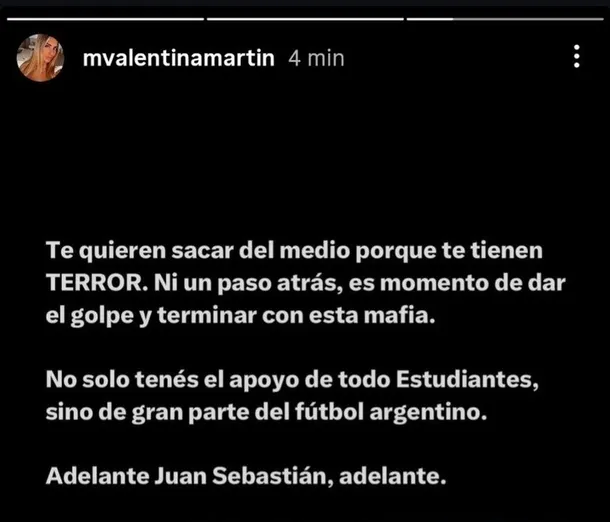 Tras pedir por la salida de los “mafiosos del fútbol argentino”, la mujer concluyó su publicación declarándose como “más veronista que nunca”. Luego de algunas minutos con muchas repercusiones, cerró su cuenta de Instagram. En un segundo texto, Valentina afirmó que a Verón lo “quieren sacar del medio” porque le “tienen terror”, y sentenció: “Ni un paso atrás, es momento de dar el golpe y terminar con esta mafia. No solo tenés el apoyo de todo Estudiantes, sino de gran parte del fútbol argentino. Adelante Juan Sebastián, adelante”.