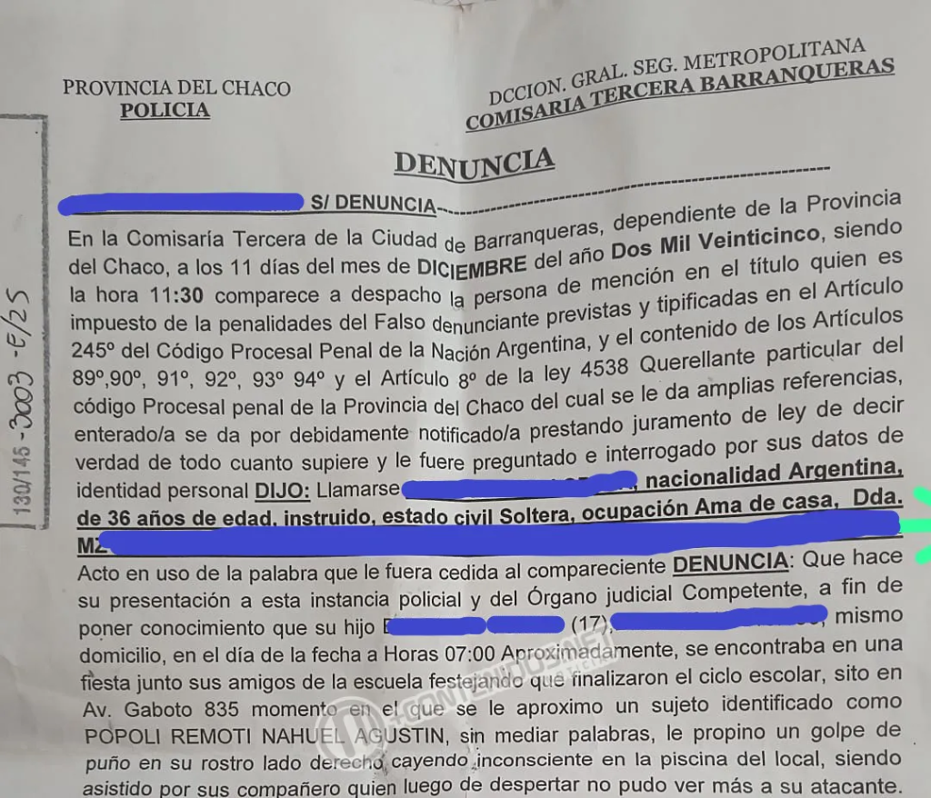 El hecho fue denunciado este jueves por la madre de la víctima en la Comisaría Tercera de Barranqueras. De acuerdo al relato de la denunciante, V. L. O., su hijo T. B. (17) se encontraba alrededor de las 7 de la mañana en una fiesta realizada en Avenida Gaboto 835, junto a compañeros de la escuela. En ese momento, un joven identificado como Nahuel Agustín Popoli Remoti (22) se le acercó sin mediar palabras y le propinó un fuerte golpe de puño en el rostro. El impacto hizo que T. B. cayera dentro de la piscina del local. Celos, el motivo del ataque