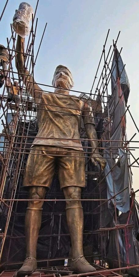 LIONEL MESSI es considerado un dios del fútbol en todo el planeta y la India no será la excepción, ya que le preparan un homenaje nunca visto que será descubierto durante su visita de tres días a las principales ciudades, en el marco del denominado GOAT India Tour que realizará junto con sus amigos Rodrigo De Paul y Luis Suárez. Se construyó una estatua que mide nada menos que 21 metros de altura y que será descubierta este sábado en Calcuta. Para realizarla trabajaron 45 personas a lo largo de 27 días, pero según se informó, por cuestiones de seguridad Leo seguiría las acciones desde el hotel donde se hospedará. El monumento está hecho de hierro y fibra de vidrio y la obra la dirigió el artista Monti Paul. Muestra al capitán de la Selección Argentina con la copa del mundo en alto en la mano derecha. Además, en el lugar habrá un fan zone denominado Hola Messi, con la imagen en tamaño real de la Pulga sentado en un trono, y un gran mural alusivo.