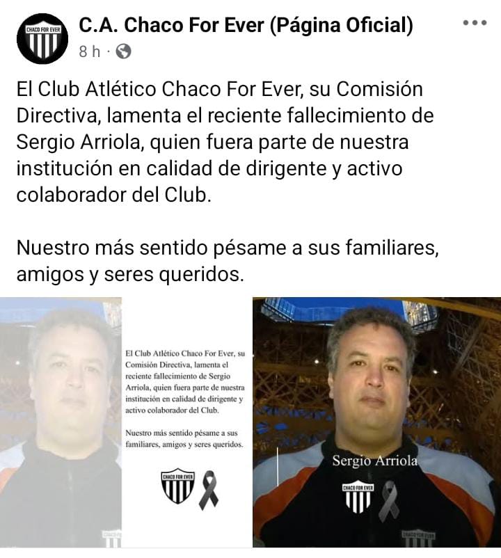 Falleció Sergio Arriola, reconocido dirigente y activo colaborador del Club Atlético Chaco For Ever. La noticia generó profundo dolor en la institución y en el ambiente futbolero de la provincia.