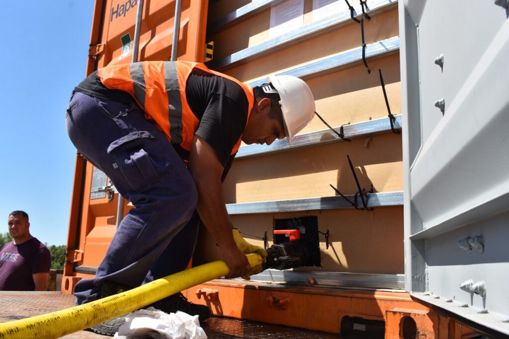 El gobernador Leandro Zdero supervisó este viernes, en el Puerto de Barranqueras, la carga de 110 toneladas de aceite de girasol de producción chaqueña que serán exportadas a España. Se trata de la primera de tres operaciones previstas hasta marzo, consolidando el proceso de reactivación y dinamización de la actividad portuaria provincial. “Queremos agradecer la confianza de quienes producen en la provincia; estamos dando dinamismo al puerto y trabajando para abrir nuevas oportunidades al mundo”, expresó el mandatario, quien estuvo acompañado por el titular de la empresa, Miguel Sartor, el ministro de la Producción y el Desarrollo Económico Sostenible, Oscar Dudik, la administradora del Puerto de Barranqueras, Alicia Azula; el subsecretario de Industria, Patricio Amarilla; el subsecretario de Coordinación de Producción, Orlando Morán; el diputado provincial, Samuel Vargas y el presidente de la Agencia Chaco, Martín Poccard.