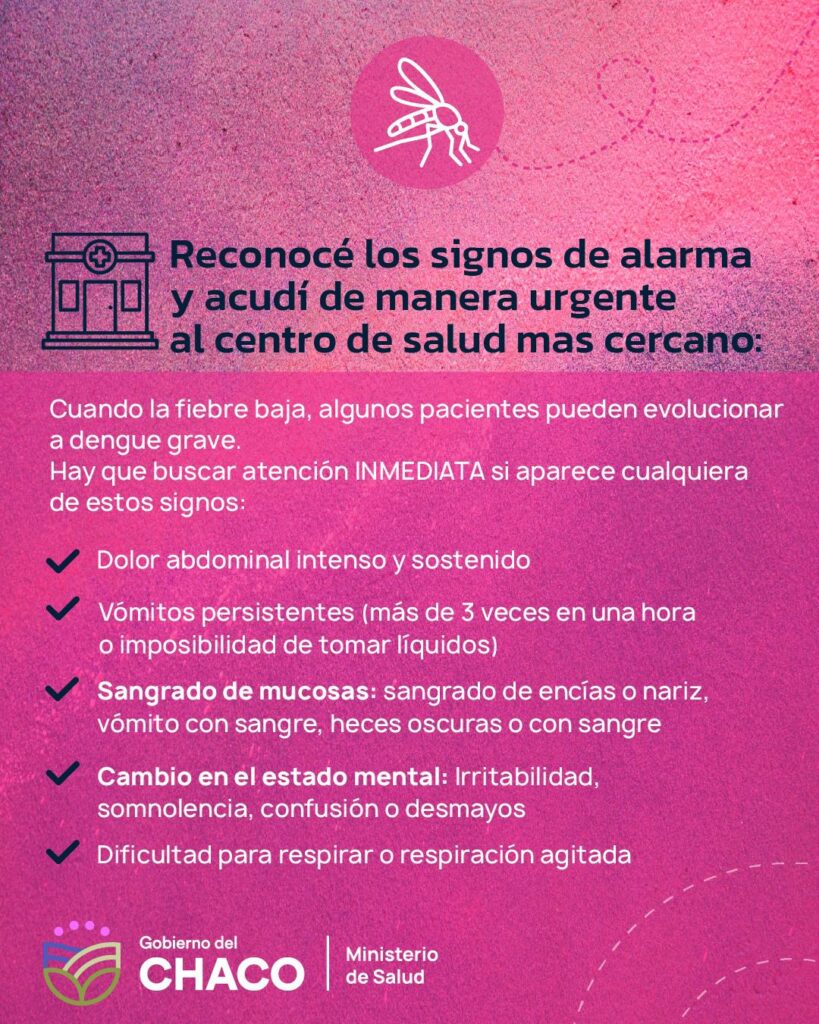 Por otra parte, las autoridades sanitarias pidieron consultar de manera inmediata al sistema de salud ante la aparición de síntomas compatibles con dengue, como fiebre alta, dolor de cabeza, dolor detrás de los ojos, cansancio intenso y erupciones en la piel.