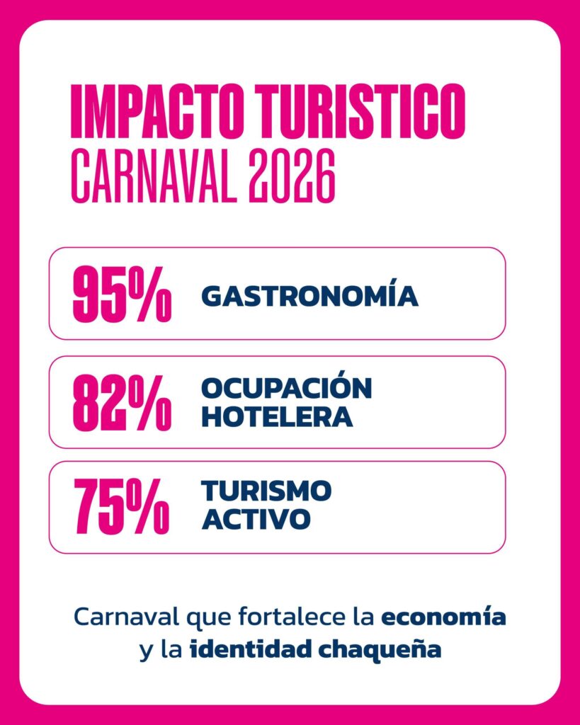 El Instituto de Turismo del Chaco junto al Instituto de Cultura, informaron que el fin de semana largo de Carnaval, del 14 al 17 de febrero de 2026, dejó un balance altamente positivo para la provincia en términos turísticos, culturales y económicos, en el marco de la Ruta de los Carnavales Chaqueños 2026, iniciativa que integró a más de 25 municipios del territorio provincial.
