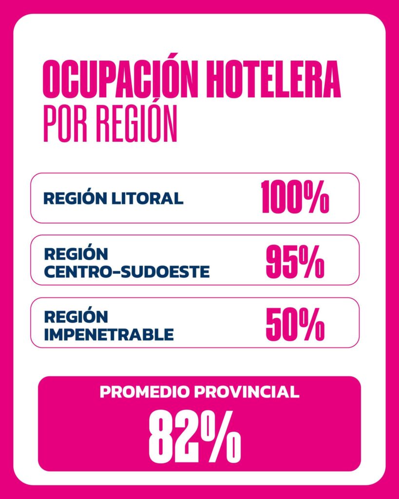 Durante el período relevado, la provincia alcanzó un promedio del 82% de ocupación hotelera, un 95% de funcionamiento del sector gastronómico y un 75% de actividad en propuestas de turismo activo, indicadores que reflejan el impacto directo del movimiento turístico en las economías regionales.