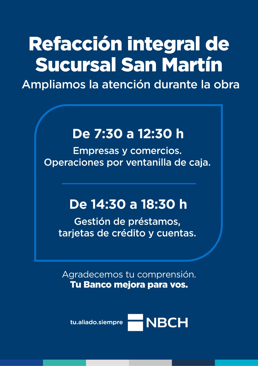 El Nuevo Banco del Chaco avanza con la obra de refacción integral de la sucursal de General San Martín y, para mantener la atención de sus clientes, a partir del lunes 23, se dispuso ampliar el horario por la tarde para gestiones de préstamos, cuentas y tarjetas de crédito. En tanto que para empresas y comercios, se atenderá por la mañana, en el formato habitual.