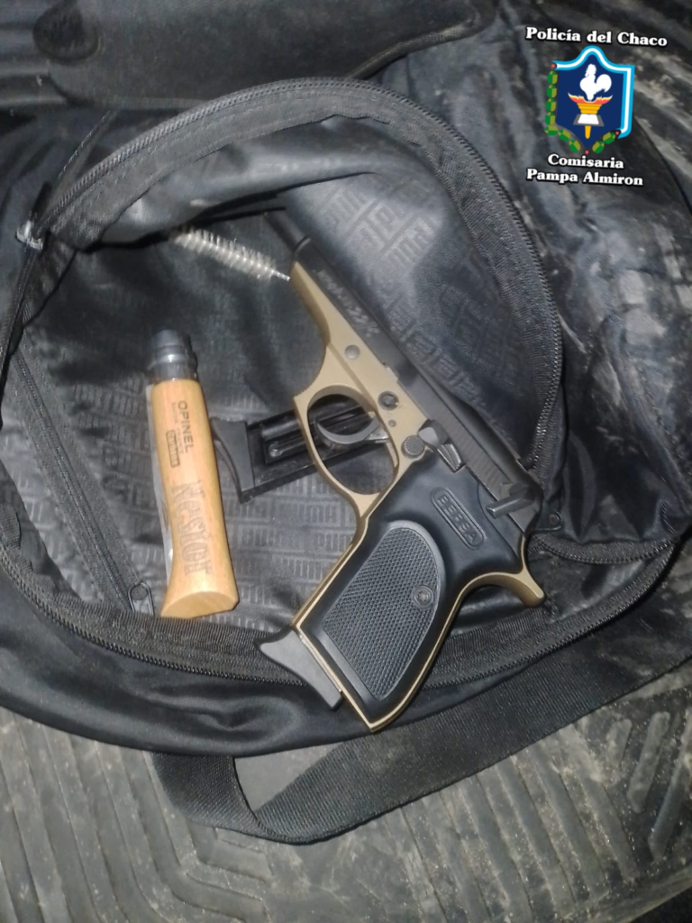 Durante la inspección del rodado, los efectivos hallaron una pistola calibre .22 con cargadores y municiones, además de un cuchillo y otros elementos, los cuales fueron incautados.
