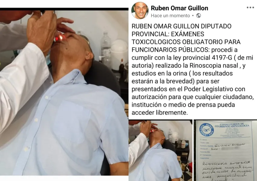 “Procedí a cumplir con la ley provincial 4197-G realizado la Rinoscopía nasal y estudios en la orina para ser presentados en el Poder Legislativo con autorización para que cualquier ciudadano, institución o medio de prensa pueda acceder libremente”, expresó el diputado en sus redes.